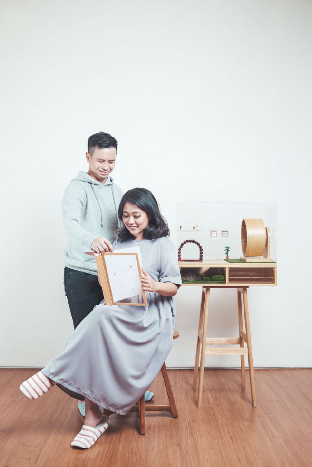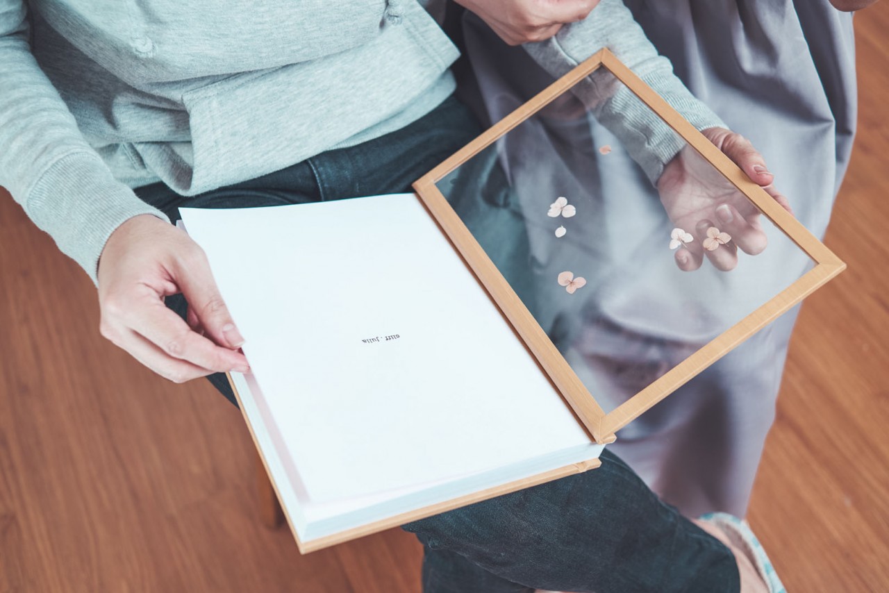 Just like my playhouse, their Lovebook has seethrough walls, framed with wood. When they open the walls, there are blush petals stuck on one wall, and a photo of mommy and daddy on another.
