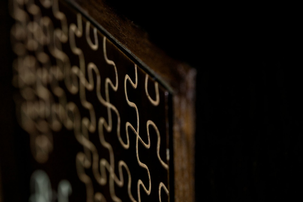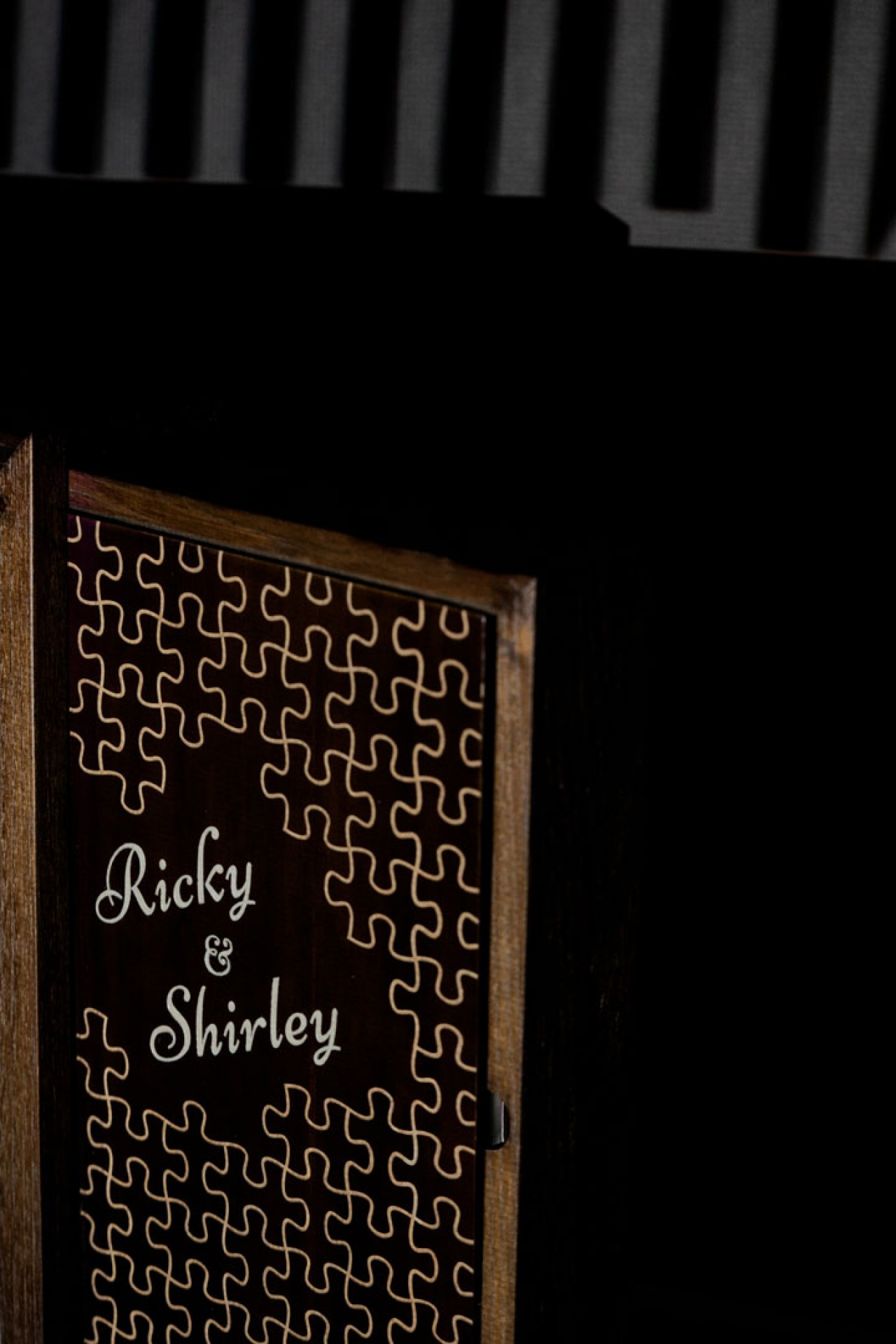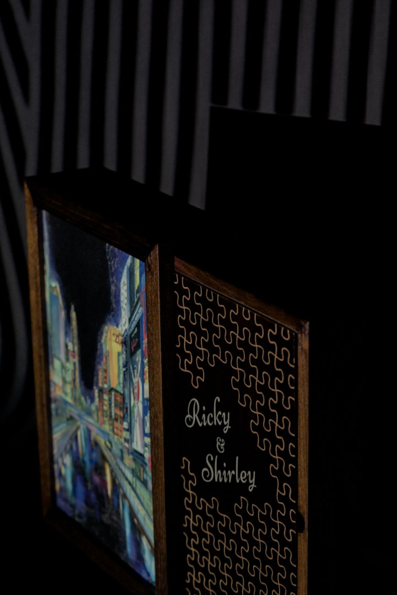 By now, you probably won’t be surprised if I tell you that Ricky and Shirley are the pieces to complete each other’s puzzles. Sliding out of the canvas frame is the actual album, with a wooden cover engraved with completed puzzle pieces. Their names, of course, engraved and glow in the dark to add to their album’s wow factor.