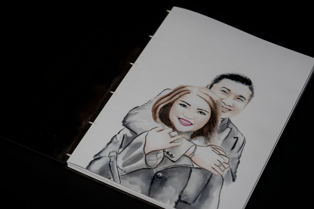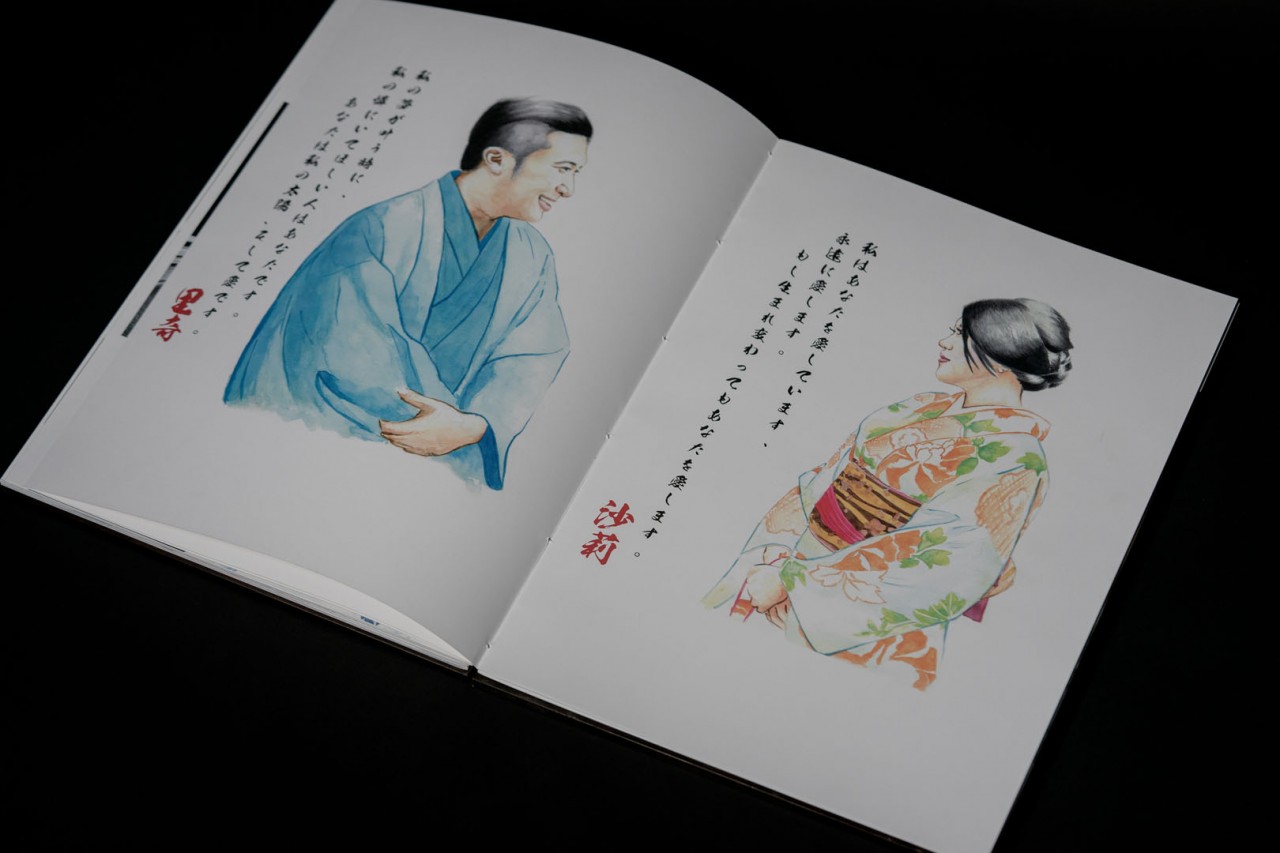 As you open their Lovebook, you are introduced to a hand-painted portrait of the lovely couple. Flipping through the pages, we travel with them all around Japan, ending with more hand-painted portraits of them both in Kimonos, with a little message to each other in Japanese.