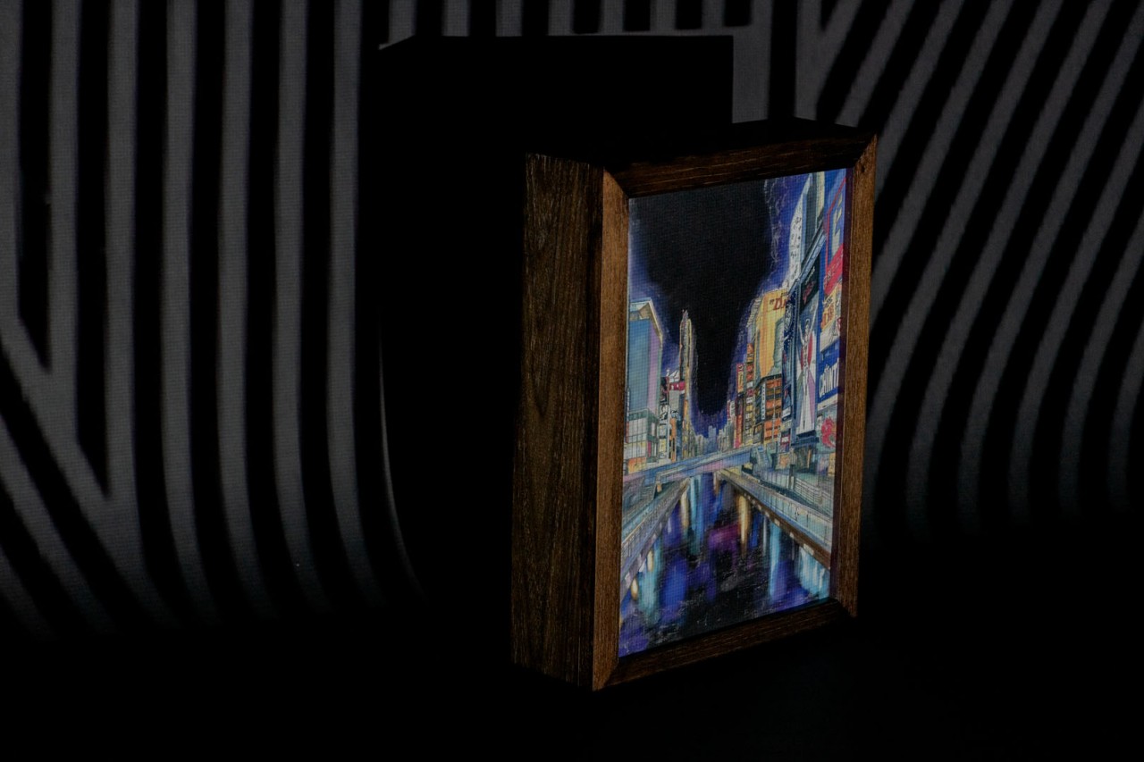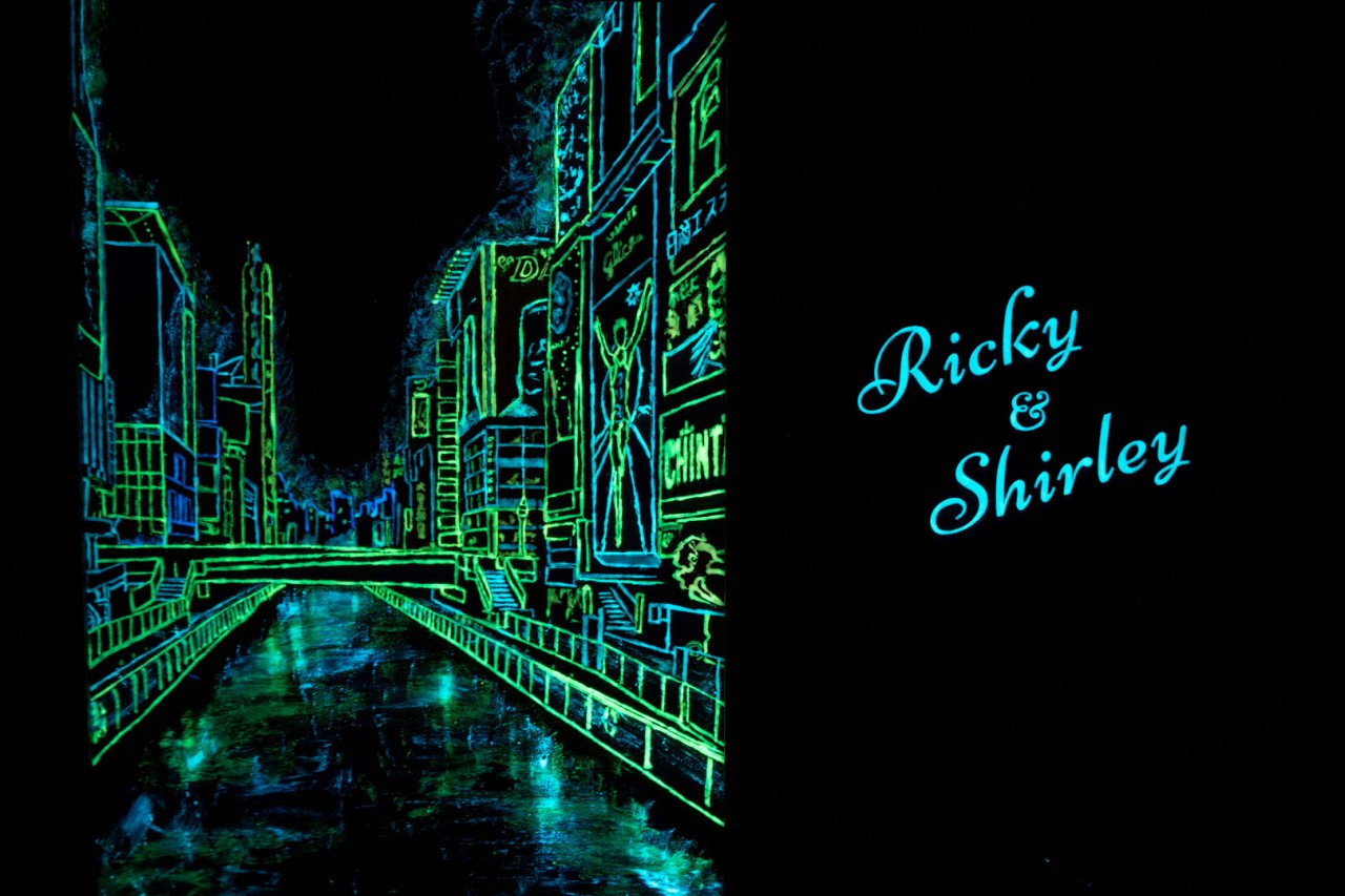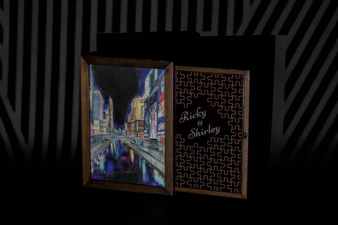 Going straight to the bright heart of Osaka, Dotonbori, where colorful mercantile buildings transform into an extravagant cluster of neon lights. This transformation was the biggest inspiration for Ricky and Shirley’s Lovebook. A wooden packaging with the idea of a framed canvas, a hand-painted scenery of Dotonbori, which glows in the dark, mimicking the real scenery of nighttime Dotonbori.