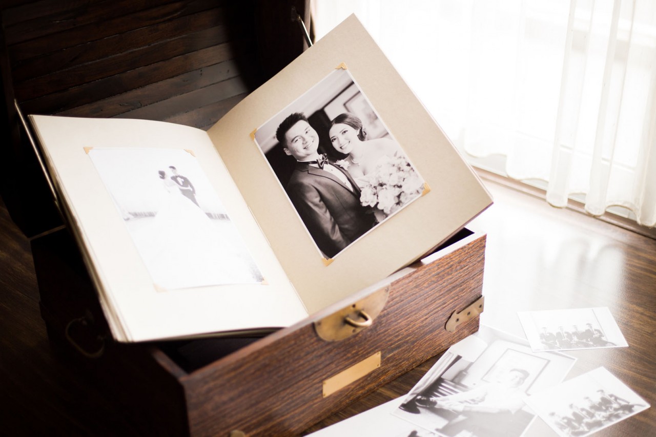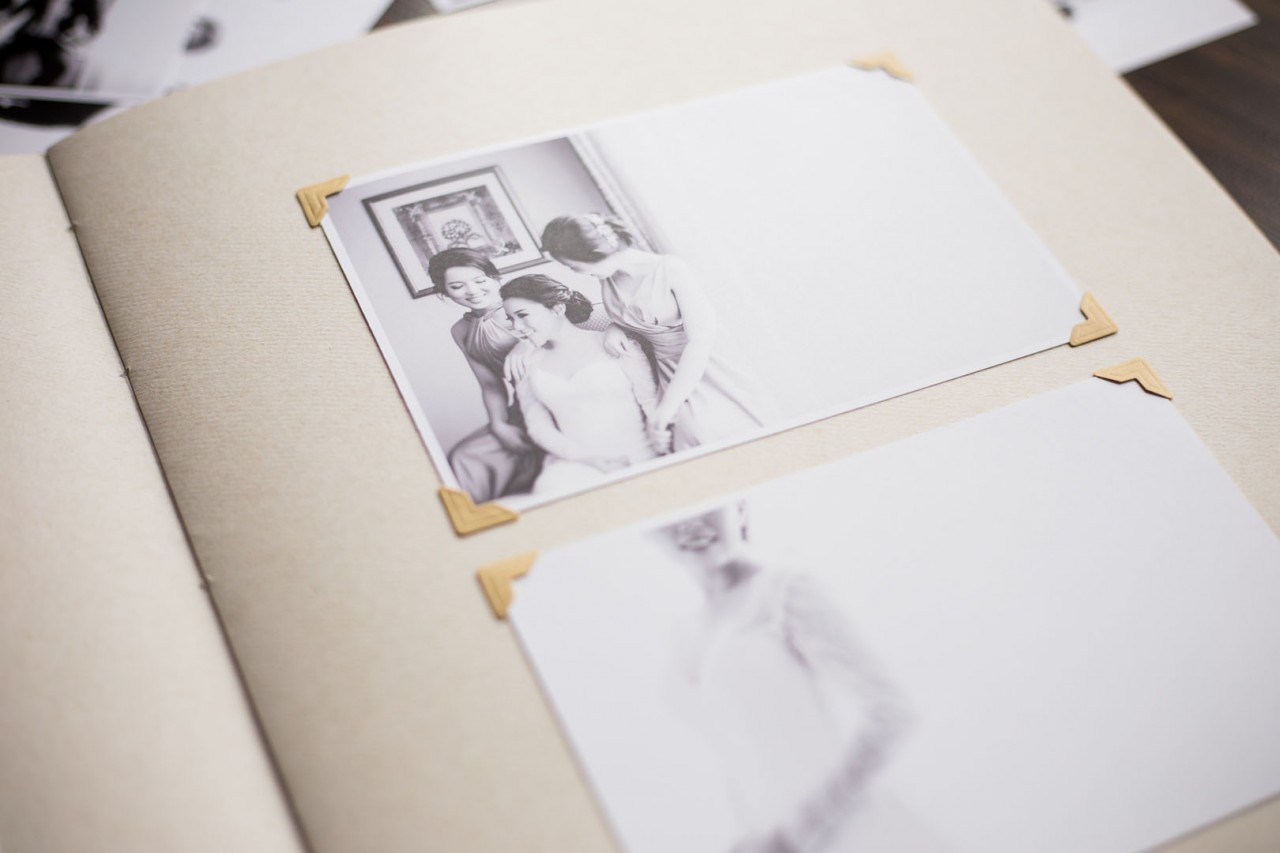 For the pages, Ayumi dreamt of papers that will match the rustic feel of the entirety. From all the samples that we showed them, she chose the perfect one. Recycled papers that look like they had been preserved in the cabinet for decades. Completing the vintage elements, the photographs were turned into black and white, surrounded with strokes of traditional Chinese ink as decorative painting.