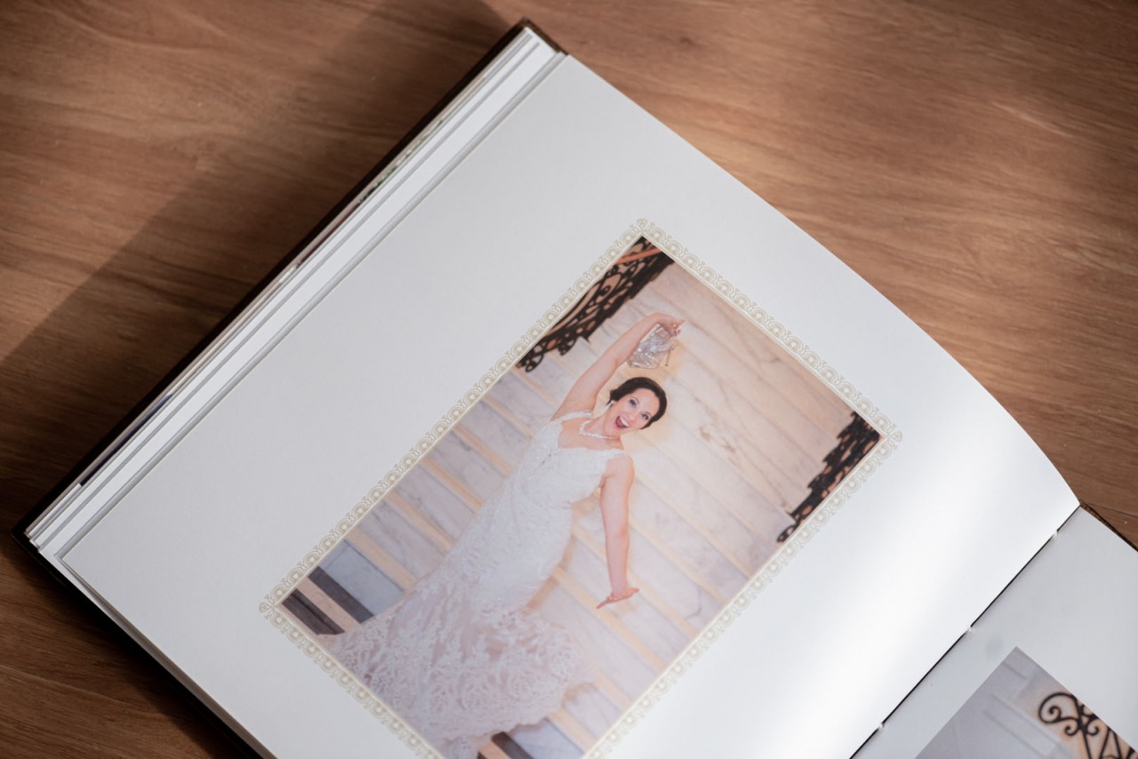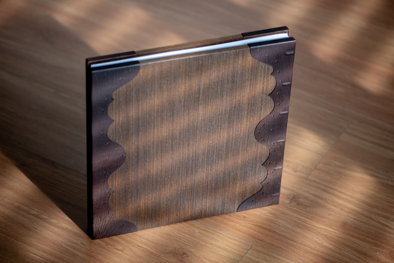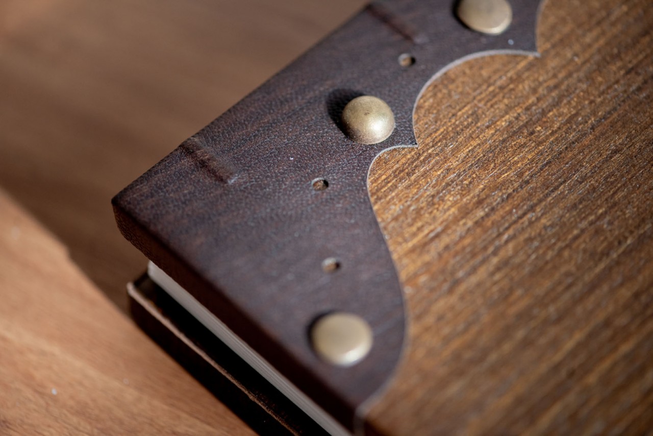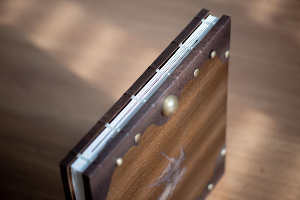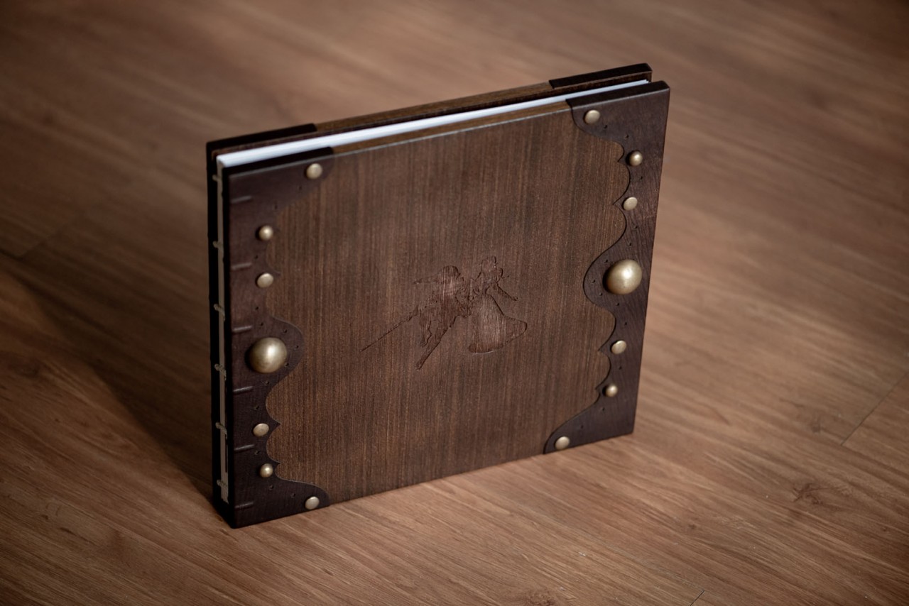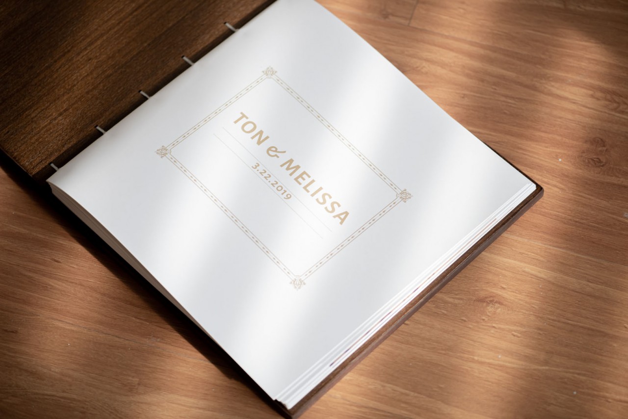 Ton and Melissa’s Lovebook looks like it’s straight out of a Game of Thrones episode or a Harry Potter sequel. Shades of dark browns decorated with brass studs embroidered the covers of the Lovebook. In front of it was an engraved illustration from Zelda; mimicking their cake topper on their big day. Finally, we pasted a laser cut genuine leather on the sides of the covers to carry on the old world theme.